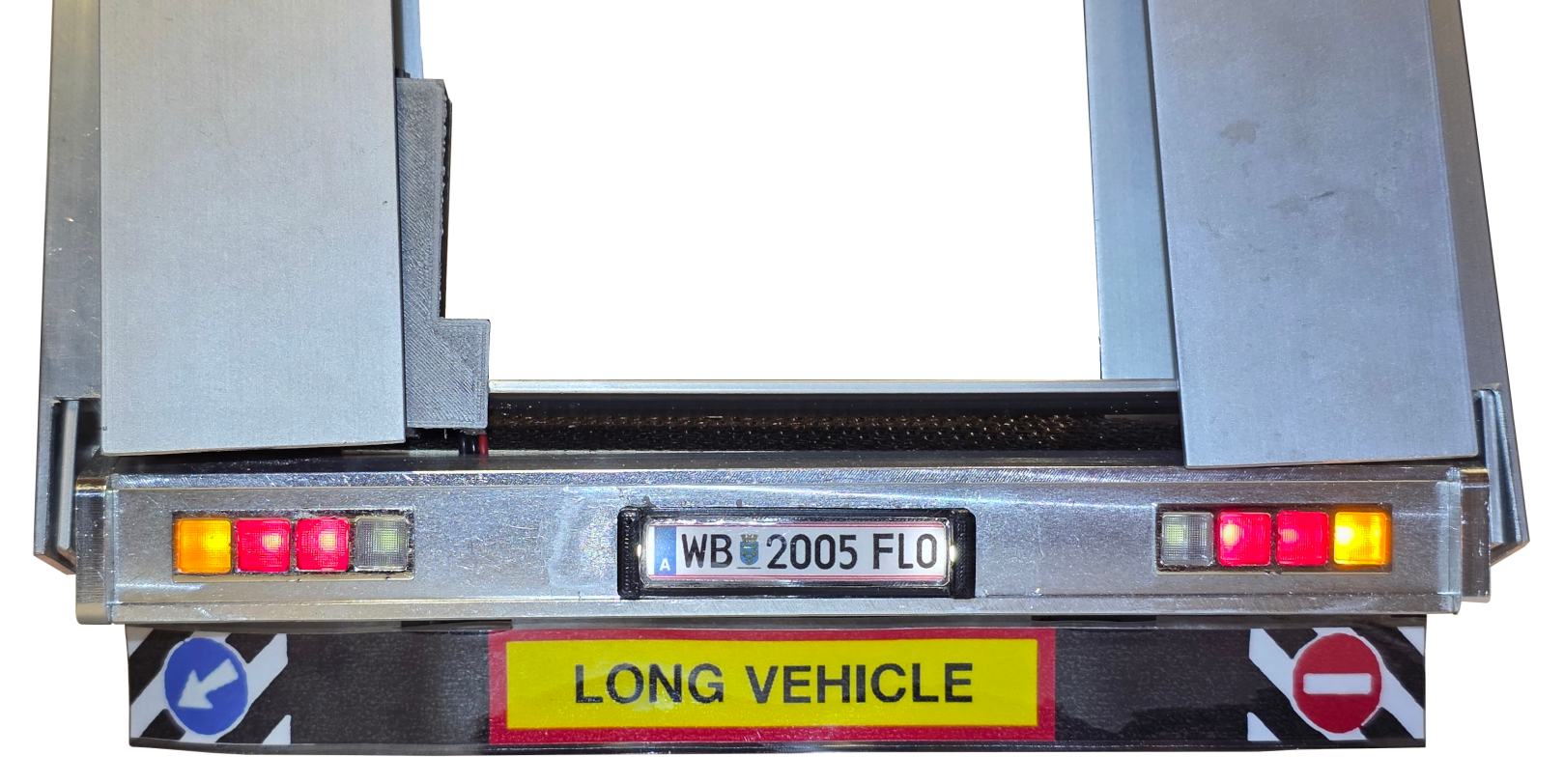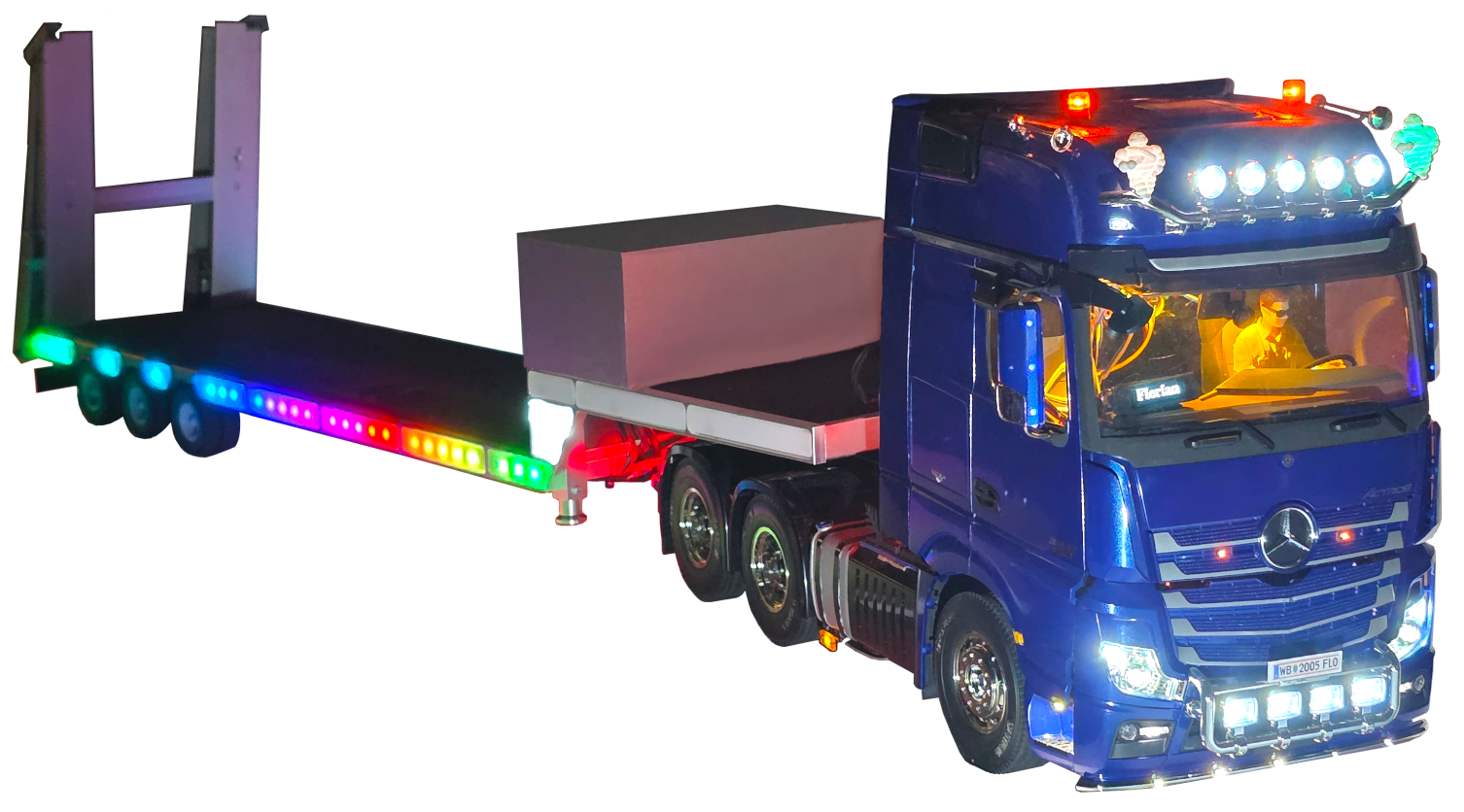 Dieser umgebaute Flachbettanhänger wurde spezifisch auf den Mercedes Benz Modell LKW optimiert. Ein zusätzlicher Mikrocontroller (Arduino Nano) am Anhänger übernimmt die Steuerung der Anhängerfunktionen und kommuniziert über UART mit dem LKW. Der Auflieger verfügt über mehrere unterschiedliche Lichterszenen, die mit adressierbaren LEDs auf beiden Seiten des Anhängers realisiert und in der Steuerungsapp ausgewählt werden können. Funktionen wie Blinker, Rücklicht, Bremslicht, Rückfahrscheinwerfer werden synchron mit der Beleuchtung des LKWs angesteuert. Zudem lassen sich die Stützen elektrisch absenken und wieder hochfahren. Durch eine spezifisch entwickelte Rampe, die sich ebenfalls elektrisch öffnen und schließen lässt, können andere 1 zu 14 Fahrzeuge ohne Beschwerden auf den Anhänger fahren und transportiert werden.