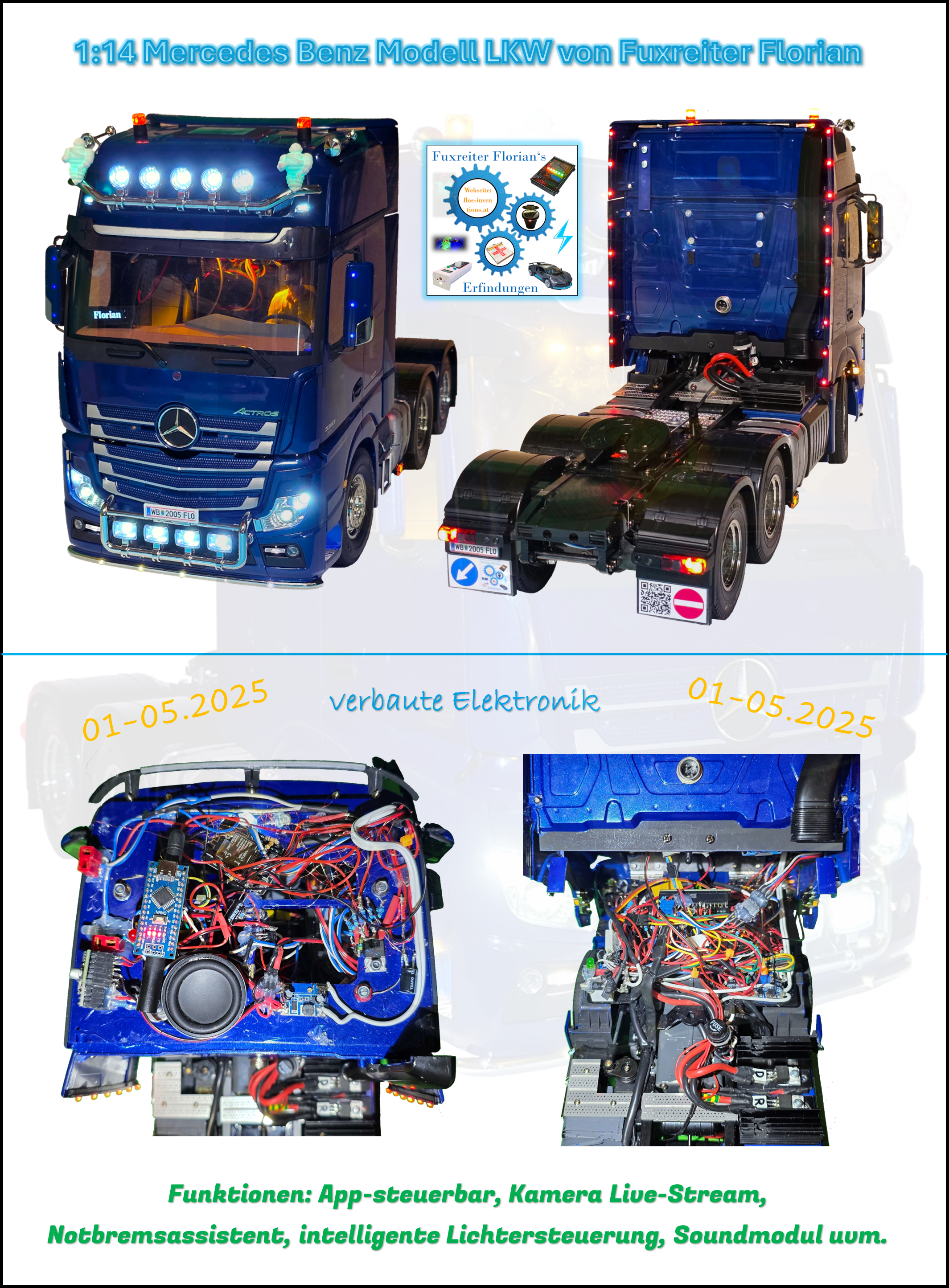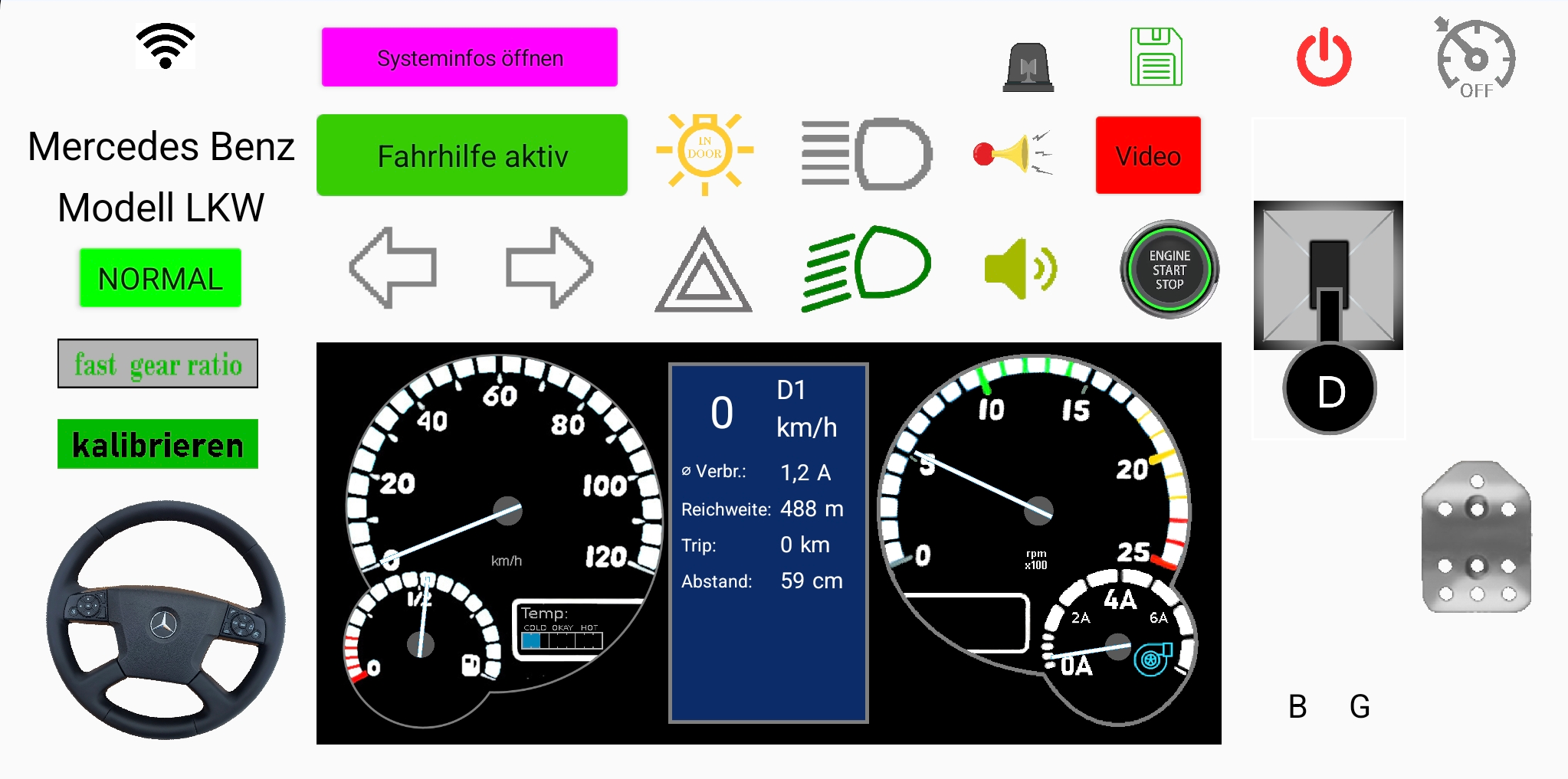 Die Steuerung des LKWs wird mithilfe einer 2,4 Ghz WLAN Verbindung gewährleistet. Das im Modell LKW verbaute Esp32Cam Modul generiert als Access Point ein WLAN mit dem Namen "Mercedes_Benz_Modell_LKW" auf Kanal 6 mit 40 Mhz Bandbreite. Verbindet sich nun ein Client (z.B. ein Smartphone) mit diesem WLAN, kann dieser Daten an den LKW senden und auch empfangen. Zurzeit ist das Modul so konfiguriert, dass maximal 1 verbundener Client auf den Kamerastream, jedoch 2 Clients zur selben Zeit auf die Steuerung (Motor, Lenkung, Lichter, ...) zugreifen können. Somit kann der LKW entweder klassisch mit einer dafür entworfenen Fernsteuerung ODER ausschließlich mit der Handyapp ODER mit Handyapp und Fernsteuerung gleichzeitig gesteuert werden. Bei der Hybridsteuerung, wo Handyapp und Fernsteuerung gleichzeitig auf das WLAN des LKWs zugreifen, wird Gas, Lenkung und Fahrmodus nur von der Fernsteuerung übernommen. Alle anderen Funktionen, wie dei Lichtersteuerung werden live zwischen den beiden Geräten synchronisiert.