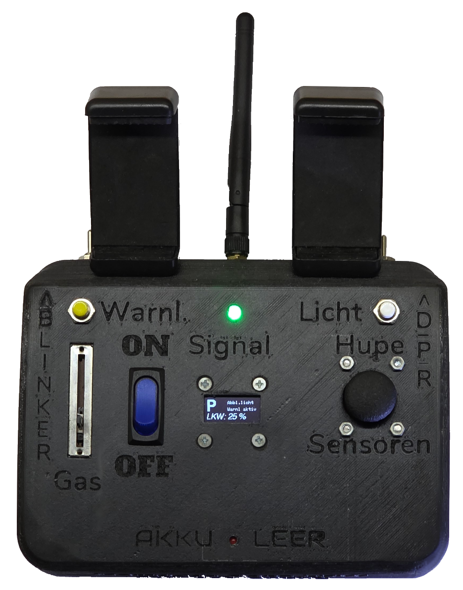 Als Alternative zur Steuerung über das Mobiltelefon kann die speziell dafür entworfene Fernbedienung verwendet werden. Der rechte hintere Schalter steuert den Fahrmodus (R/P/D). Wenn der Gashebel im P Modus auf über 80% gestellt ist, wird der Leerlauf N eingelegt und der LKW lässt sich widerstandsfrei schieben, da er dann nicht mehr mit dem Getriebe verbunden ist. Durch einen Klick auf den Joystick wechselt man im Getriebe zwischen dem ersten und zweiten Gang. Dies ist nur im Stillstand möglich! Der linke hintere Taster dient zur Blinkersteuerung und Start des LKWs. (lange links = Warnblinkanlage, lange rechts = starten) Am verbauten OLED Display werden alle benötigten Daten und sogar Informationen wie Akkustand oder Geschwindigkeit des LKWs angezeigt. Die mittig oben vebaute LED zeigt die Signalstärke der Verbindung an. (grün = sehr gute Verbindung, gelb = schlechte Verbundung, rot = keine Verbindung zum LKW) Der rechte Joystick dient horizontal zur Lenkung und vertikal zur Betätigung von Lichthupe und Hupe bzw. zur Auswahl der Fahrassistenzmodis. Kalibriert kann die Lenkung durch ein Spindelpotentiometer auf der Rückseite der Fernsteuerung werden. Die Spannungsversorgung der Fernbedienung erfolgt über 4 AA Batterien / Akkus. Der Gashebel ist so aufgebaut, dass sich in den unteren 25%, Bremse und Leerlauf befinden und darüber in 255 Stufen die Motorleistung gesteuert werden kann.