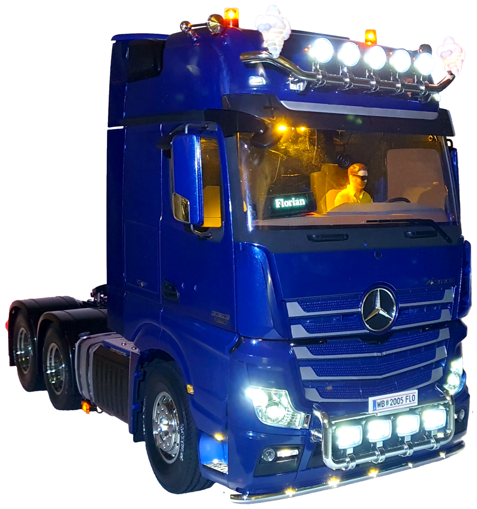 Dieses einzigartig entwickelte Modell eines Mercedes Benz LKWs im Maßstab 1 zu 14 überzeugt durch sein innovatives Design, das eingebaute Beleuchtungssystem und die fortschrittlichen Assistentsysteme, mit denen es ausgestattet ist. Die neumoderne, einfach zu bedienende Steuerung mithilfe einer Smartphoneapp (über WLAN-DIRECT) ermöglicht ein perfektes Fahrverhalten und eine übersichtliche Steuerung der Beleuchtungen, Blinker und weiterer Funktionen des LKWs. Die auf der Vorderseite eingebaute Kamera überträgt ein Live-Video in die eigens entwickelte Handyapp. Zudem ist der LKW mit einem Notbremsassistenten vorne und hinten ausgestattet, der mögliche Kollisionen erkennt und den Lastkraftwagen kurz vor einer Kollision automatisch bis zum Stillstand abbremst